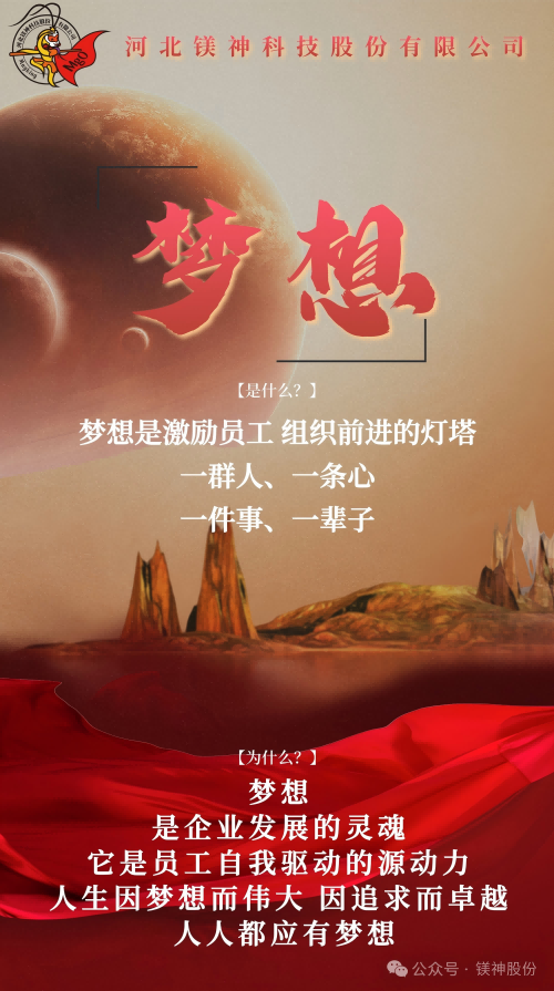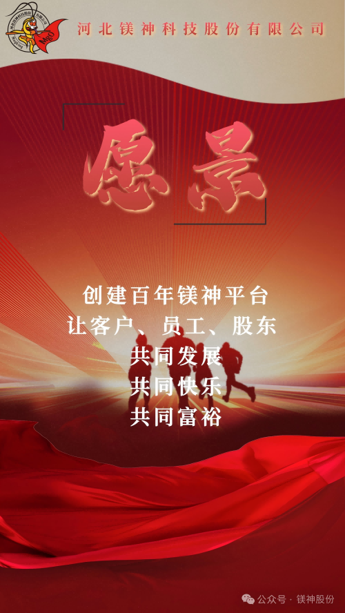 我們的企業(yè)愿景是:創(chuàng)建百年鎂神平臺,讓客戶、員工、股東共同發(fā)展、共同快樂、共同富裕。