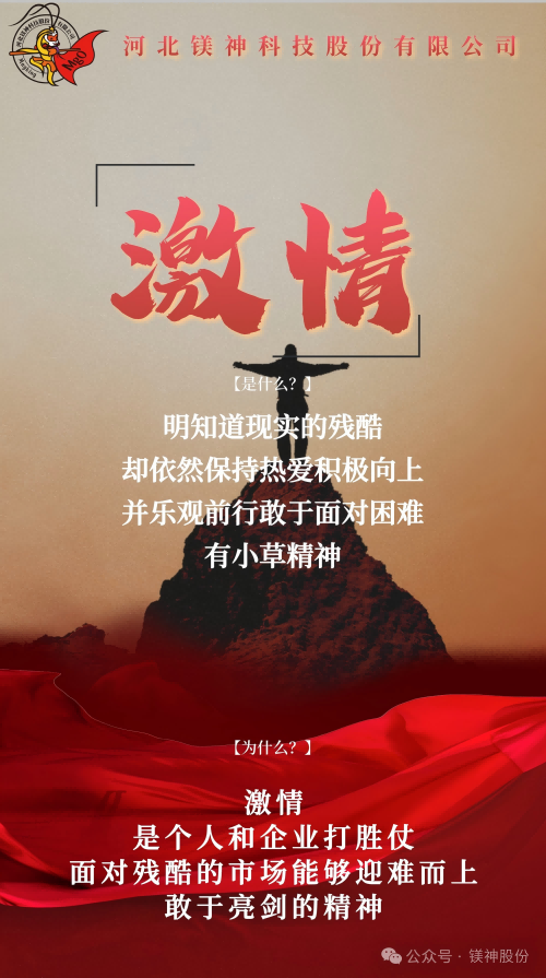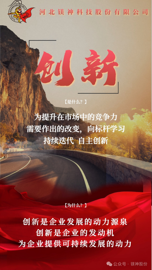 從太行山麓到走向世界舞臺的鎂質(zhì)新材料領(lǐng)航者,鎂神科技以文化力量開啟新征程。近期,經(jīng)過全體鎂神人的共創(chuàng),承載著鎂神人精神基因的企業(yè)文化2.0升級版正式發(fā)布,同時公眾號將會開展“鎂神人企業(yè)文化故事”發(fā)布活動,它是指引鎂神人行動的燈塔,是我們凝聚團隊力量,激發(fā)創(chuàng)新活力,助力企業(yè)騰飛的重要舉措;是我們傳承精神基因,引領(lǐng)行業(yè)潮流,邁向世界舞臺的內(nèi)生動力,是我們對“創(chuàng)建百年鎂神平臺”的堅定信念與承諾。