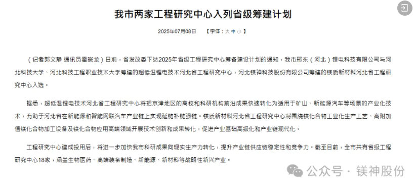 2025年7月8日,河北省發展和改革委員會正式公布了新一批河北省工程研究中心籌建計劃入選名單。由河北鎂神科技有限公司(簡稱:鎂神科技)牽頭籌建的“鎂質新材料河北省工程研究中心”經過嚴格遴選和專家評審,成功獲批立項,正式列入省級工程研究中心籌建計劃名單!這是鎂神科技發展歷程上的又一重要里程碑,也是河北省對我公司在鎂質新材料領域創新能力與發展潛力的高度認可!